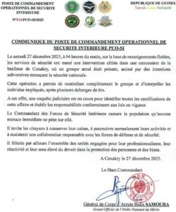 Le Poste de Commandement Opérationnel de Sécurité Intérieure (PCO-SI) a publié un important communiqué concernant les échanges de tirs survenus à Sonfonia, dans la banlieue de Conakry, dans la nuit de vendredi à samedi.
